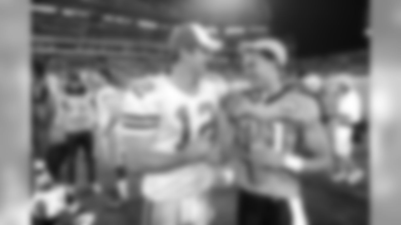Tennessee Titans quarterback Matt Cassel (16) talks with Green Bay Packers quarterback Aaron Rodgers (12) after an NFL football game Sunday, Nov. 13, 2016, in Nashville, Tenn. The Titans won 47-25. (AP Photo/Mark Zaleski)