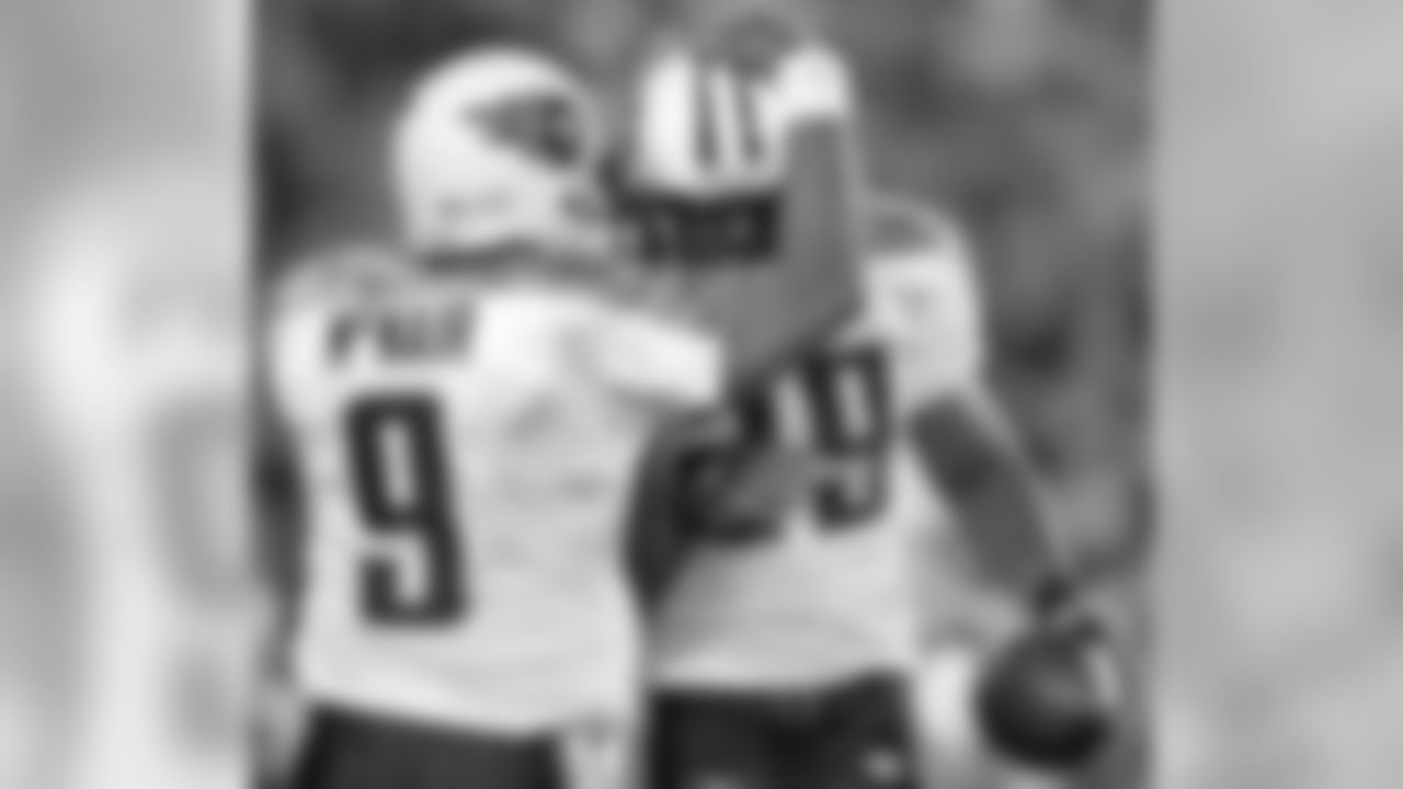 Tennessee Titans tight end Delanie Walker (82) is congratulated by linebacker Wesley Woodyard (59) after Walker scored a touchdown against the Green Bay Packers in the first half of an NFL football game Sunday, Nov. 13, 2016, in Nashville, Tenn. (AP Photo/Mark Zaleski)