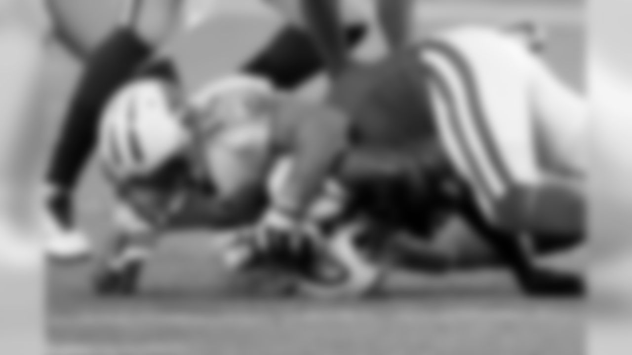 A few plays later, Mariota was sacked by Jets defensive lineman Leonard Williams, but he popped up from the ground without hesitation and on the next play completed a pass to running back Derrick Henry.