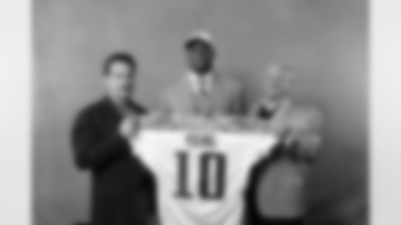 Vince Young, a quarterback from Texas, a holds up a Tennessee Titans jerseys after being selected third overall in the first round of the NFL Draft, Saturday, April, 29, 2006 at Radio City Music Hall in New York. At left is NFL commissioner Paul Tagliabue. (AP Photo/Julie Jacobson)