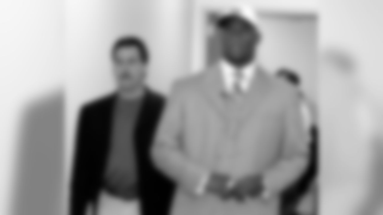 Former Texas quarterbackl Vince Young who was the third pick overall in the first round of the NFL Draft by the Tennessee Titans walks down the hall of the Titans headquarters with head coach Jeff Fisher, left during his introduction to the media on Saturday April 29, 2006, in Nashville, Tenn. (AP Photo/Neil Brake)