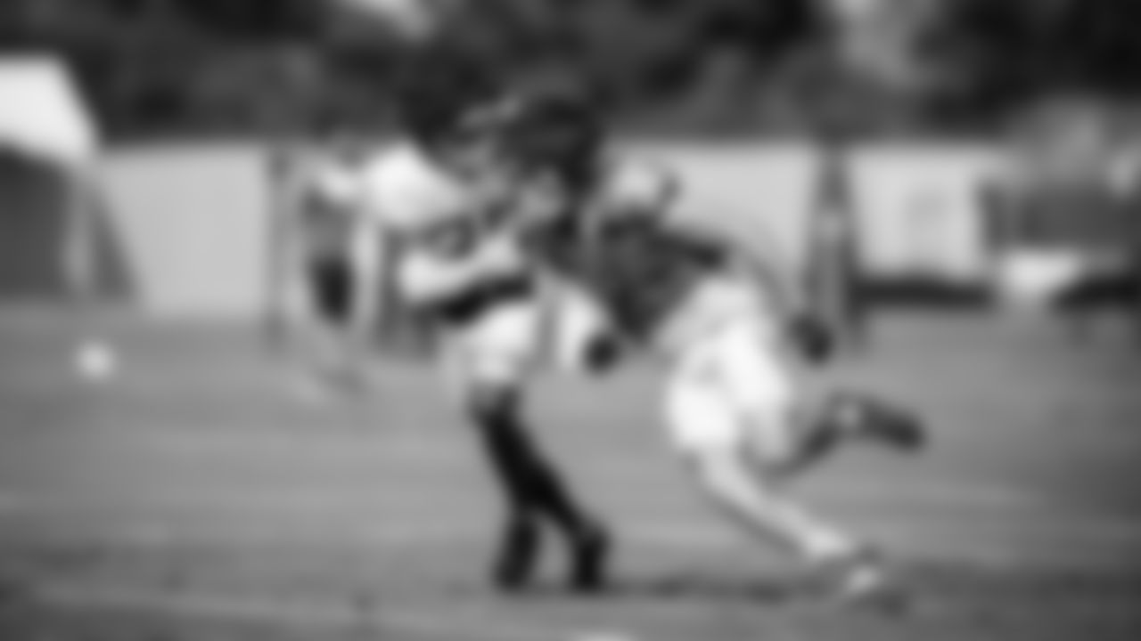 Tight end David Martin-Robinson #88 of the Tennessee Titans and Cornerback Jarvis Brownlee Jr. #29 of the Tennessee Titans during training camp practice on August 04, 2024 in Nashville, TN. Photo By Jessie Rogers/Tennessee Titans