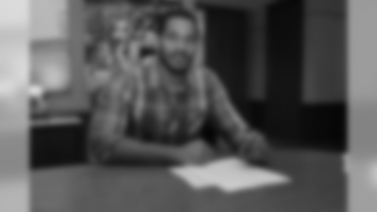 Newly-signed linebackers Brian Orakpo and Derrick Morgan sign their contracts at Saint Thomas Sports Park. (Photos: Gary Glenn, Jeff Harding)
