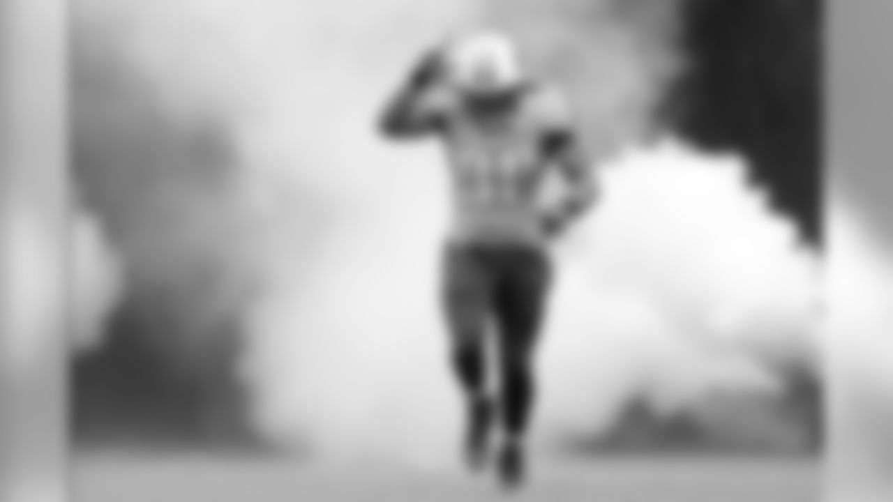 Tennessee Titans linebacker Derrick Morgan (91) runs out of the tunnel during the second half of an NFL football game against the Philadelphia Eagles on Sunday, Sept. 30, 2018 in Nashville, Tenn. The Titans defeated the Eagles 26-23 in overtime. (Perry Knotts via AP)