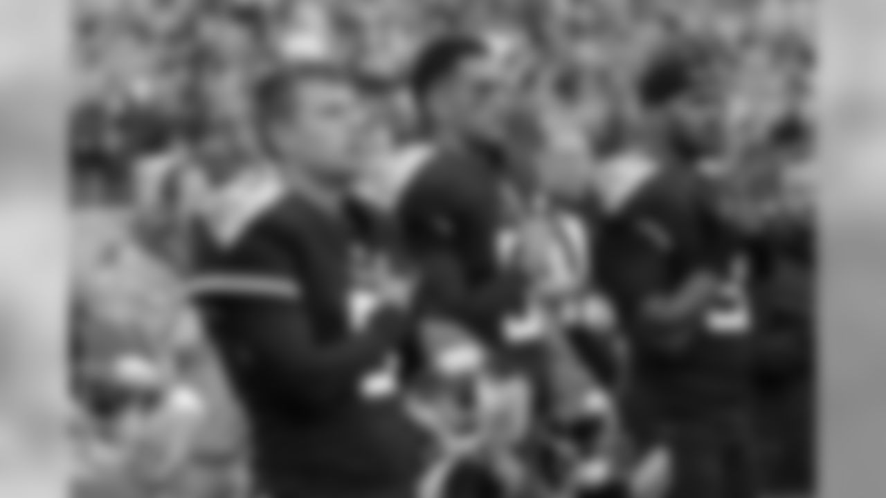 Tennessee Titans punter Brett Kern (6), quarterback Marcus Mariota (8) and linebacker Derrick Morgan, right, stand for the national anthem before an NFL football game against the Baltimore Ravens Sunday, Oct. 14, 2018, in Nashville, Tenn. (AP Photo/James Kenney)
